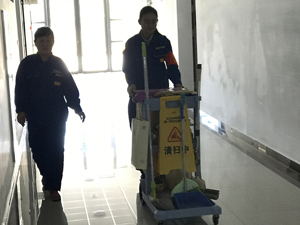 在11月11日进行的振声苑志愿服务中,每位志愿者跟随一位物业工作人员进行了教学楼的卫生保洁工作。志愿者们换上了朴素的蓝色制服,拾起教室角落里的垃圾,扫去走廊里的脚印,抹掉镜子上的灰尘,冲净卫生间的各个死角。